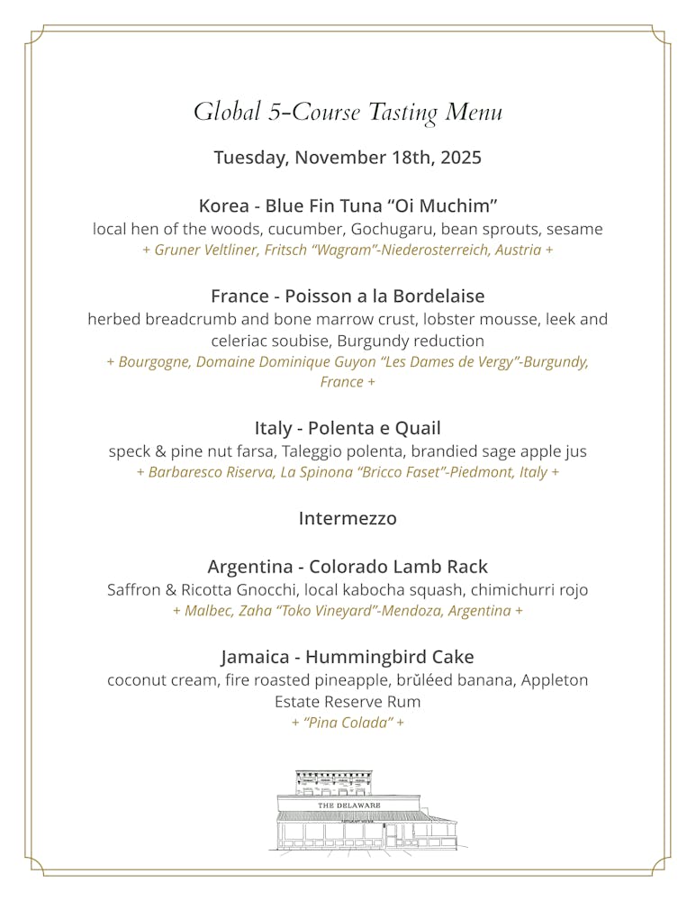 Embark on a culinary journey around the world with our immersive 5-Course Global Wine Tasting Dinner on Tuesday, November 18th at 5:30 pm. Each course is thoughtfully crafted to celebrate a different region, pairing regional flavors with carefully selected wines to create memorable moments from starter to dessert! After each pairing, your passport gets a stamp, marking your progress through our globe of taste!